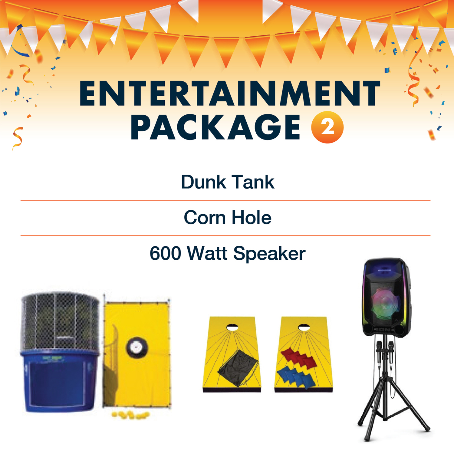 This package includes a Dunk Tank, Cornhole Set, 600 Watt Bluetooth Speaker.