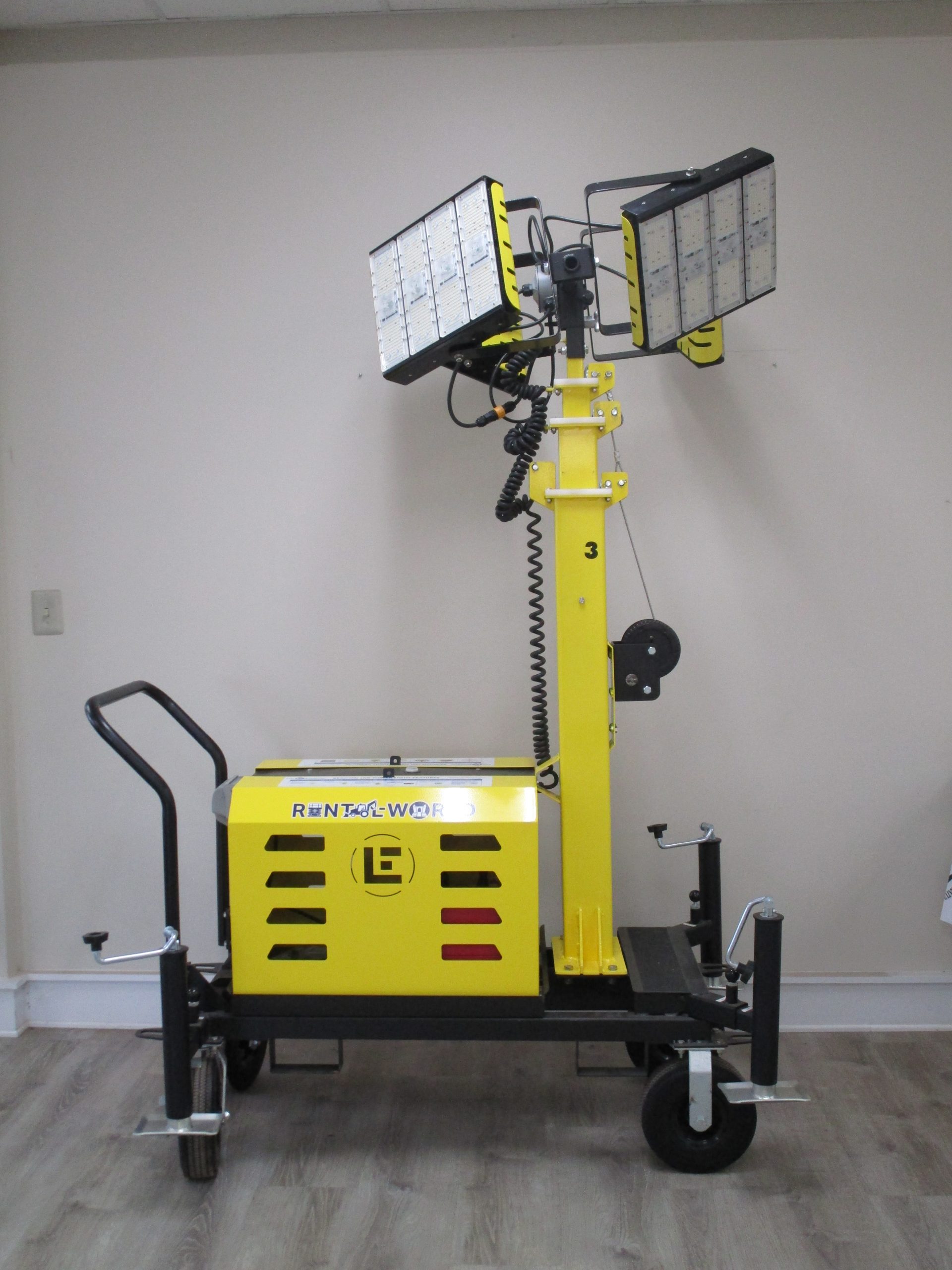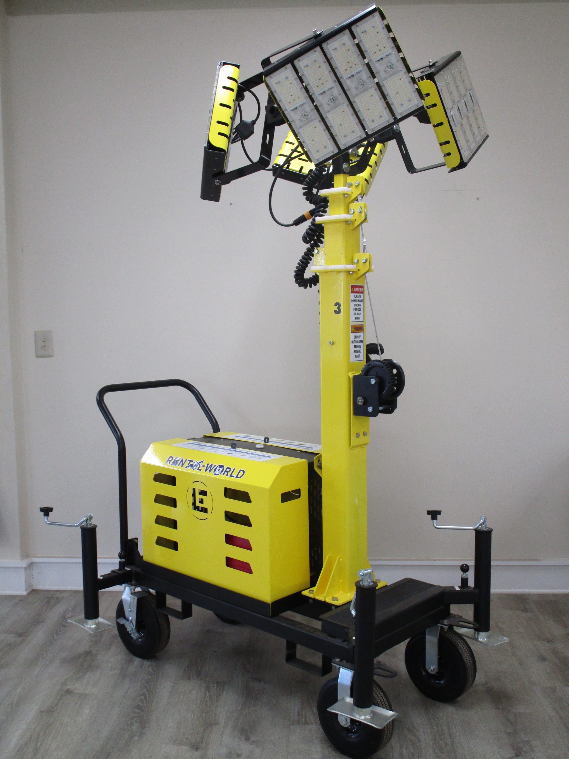 This portable 4 LED light tower can be used as a diffused light tower, electric powered light tower or a generator power light tower. The light heads are Beacon980 high-output LED floodlights that will provide you plenty of light for safety on the jobsite.